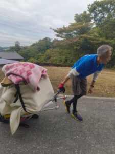 ドラム洗濯機を台車に乗せてスイッチONで登り、急坂は、キャタピラで登りました!